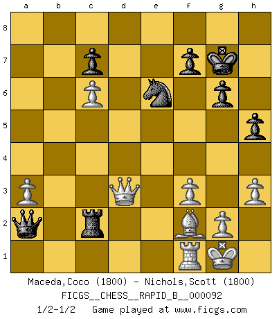 Last move : 1/2-1/2 2008 June 21 21:35:5 [Event "FICGS__CHESS__RAPID_B__000092"] [Site "FICGS"] [Date "2008.05.21"] [Round "1"] [White "Maceda,Coco"] [Black "Nichols,Scott"] [Result "1/2-1/2"] [WhiteElo "1800"] [BlackElo "1800"] 1.Nf3 Nf6 2.d4 g6 3.c4 Bg7 4.Nc3 O-O 5.e4 d6 6.Be2 e5 7.O-O exd4 8.Nxd4 Re8 9.f3 Nh5 10.Be3 Nc6 11.Nxc6 bxc6 12.Qd2 a5 13.Rad1 Qe7 14.Rfe1 Rb8 15.c5 d5 16.Bf2 dxe4 17.Bc4 Be6 18.Bxe6 Bxc3 19.bxc3 Qxe6 20.Rxe4 Qc8 21.Rxe8+ Qxe8 22.c4 a4 23.a3 Ng7 24.Qa5 Qe2 25.Qxa4 h5 26.Re1 Qa2 27.Qxc6 Rb2 28.Rf1 Ne6 29.Qa6 Kh7 30.h3 Rc2 31.c6 Rxc4 32.Qb5 Rc2 33.Qd3 Kg7 1/2-1/2 Reti Opening Kingside Castling by player Black (move 4) Kingside Castling by player White (move 7) This chess game ended in a draw. Follow this game move after move (download)Life is like a game of Chess, changing with each move. (Chinese proverb) Wenn ich Weiß habe gewinne ich weil ich Weiß habe, wenn ich Schwarz habe gewinne ich weil ich Bogoljubov bin. (Efim Bogoljubov) El Ajedrez es de 30 a 40 por ciento psicología. Uno no cuenta con esto cuando se juega contra una computadora. No lo puedo confundir. (Judith Polgar) Vous m'avez demandé de vous exposer quel est le fondement de la prière. Je ne fais que préparer les pièces du jeu sur la table... Nous sera-t-il permis d'en adopter les règles et si nous les appliquons scrupuleusement nous ne tarderons pas à faire mat le Roi divin ! Il ne pourra échapper à nos mains. (Sainte Thérèse d'Avila, Chemin de perfection) To steal ideas from one person is plagiarism. To steal from many is research. (Unknown)