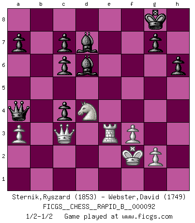 Last move : 1/2-1/2 2008 June 27 19:53:55 [Event "FICGS__CHESS__RAPID_B__000092"] [Site "FICGS"] [Date "2008.05.21"] [Round "1"] [White "Sternik,Ryszard"] [Black "Webster,David"] [Result "1/2-1/2"] [WhiteElo "1853"] [BlackElo "1749"] 1.e4 e5 2.Nf3 Nc6 3.d4 exd4 4.Bc4 Nf6 5.e5 d5 6.Bb5 Ne4 7.Nxd4 Bd7 8.Bxc6 bxc6 9.O-O Bc5 10.Be3 Qe7 11.Re1 O-O 12.f3 Ng5 13.Qd2 Rab8 14.c4 f6 15.exf6 Qxf6 16.Nc3 Rfe8 17.Rad1 dxc4 18.Re2 h6 19.h4 Rxe3 20.Rxe3 Ne6 21.Nce2 Nxd4 22.Nxd4 Bd6 23.Qc2 Qxh4 24.Kf1 Rxb2 25.Qxb2 Qh1+ 26.Kf2 Qxd1 27.Qc3 Qa4 28.a3 1/2-1/2 Scotch gambit : Dubois-Reti defense Kingside Castling by player White (move 9) Kingside Castling by player Black (move 11) This chess game ended in a draw. Follow this game move after move (download)The mistakes are there, waiting to be made. (Savielly Tartakower) Kein Schachspieler kann gut schlafen. (H. G. Wells) La captura del Rey enemigo es la finalidad pero no el primer objetivo de la partida. (William Steinitz) Karpov est une pièce de musée. (Garry Kasparov) A good player is always lucky. (Capablanca)