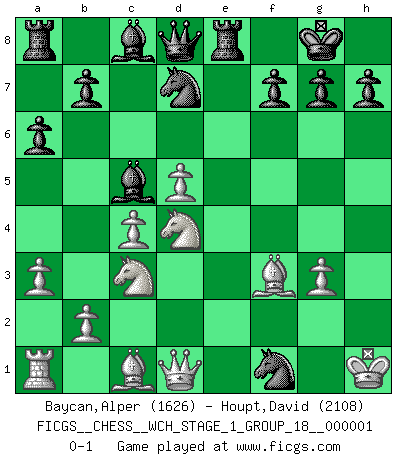 Last move : 0-1 2006 August 24 20:29:24 [Event "FICGS__CHESS__WCH_STAGE_1_GROUP_18__000001"] [Site "FICGS"] [Date "2006.07.19"] [Round "1"] [White "Baycan,Alper"] [Black "Houpt,David"] [Result "0-1"] [WhiteElo "1626"] [BlackElo "2108"] 1.e4 e5 2.f4 d5 3.exd5 exf4 4.Nf3 Nf6 5.c4 Bd6 6.Nc3 O-O 7.Be2 c5 8.O-O a6 9.Kh1 Re8 10.d4 Ng4 11.a3 Nd7 12.dxc5 Bxc5 13.Nd4 f3 14.Bxf3 Nxh2 15.g3 Nxf1 0-1 KGD : Falkbeer counter-gambit Kingside Castling by player Black (move 6) Kingside Castling by player White (move 8) Player Black won this chess game. Follow this game move after move (download)We must make sure that Chess will not be like a dead language, very interesting, but for a very small group. (Sytze Faber) Ja, jede Frau in Holland liebt mich bestimmt, und alle Männer hassen mich. (Loek van Wely) El Ajedrez es despiadado: debes de estar preparado para matar gente. (Nigel Short) Mais n'est-ce pas déjà le limiter injurieusement que d'appeler les échecs un jeu? N'est-ce pas aussi une science, un art, ou quelque chose qui, comme le cercueil de Mahomet entre ciel et terre, est suspendu entre l'un et l'autre, et qui réunit un nombre incroyable de contraires ? (Stefan Zweig) Methinks King Thibault should dub Marius Zubac a knight of the square board... I mean table, henceforth addressing him as Sir Marius, and bestow on him a suitable land from the kingdom of FICGS & marry him off to a worthy, fair maiden, lest he slice our heads with his mighty sword in his wrath. (Dinesh De Silva)