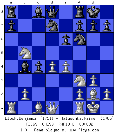Last move : 1-0 2008 July 20 3:37:51 [Event "FICGS__CHESS__RAPID_B__000092"] [Site "FICGS"] [Date "2008.05.21"] [Round "1"] [White "Block,Benjamin"] [Black "Haluschka,Rainer"] [Result "1-0"] [WhiteElo "1711"] [BlackElo "1785"] 1.d4 Nf6 2.Nf3 d5 3.c4 e6 4.g3 dxc4 5.Bg2 c6 6.O-O Nbd7 7.Nc3 b5 8.e4 Bb4 9.a4 O-O 10.axb5 cxb5 11.Nxb5 1-0 This chess game has been lost on time (started : 2008.05.21 15:25:12) Queen's pawn game Kingside Castling by player White (move 6) Kingside Castling by player Black (move 9) Player White won this chess game. Follow this game move after move (download)The battle for the ultimate truth will never be won. And that's why Chess is so fascinating. (Hans Kmoch) Es hat in meinem Leben Zeiten gegeben, da ich sehr nahe daran war zu glauben, daß ich auch nicht eine einzige Schachpartie verlieren könnte. (José Raúl Capablanca) Mis oponentes también hacen buenas movidas. A veces yo no tomo esas cosas en consideración. (Bobby Fischer) Il vaut toujours mieux jouer un plan faux de façon logique que de n'avoir pas de plan du tout. (Victor Kortchnoï) If I had no sense of humor, I would long ago have committed suicide. (Mahatma Gandhi)