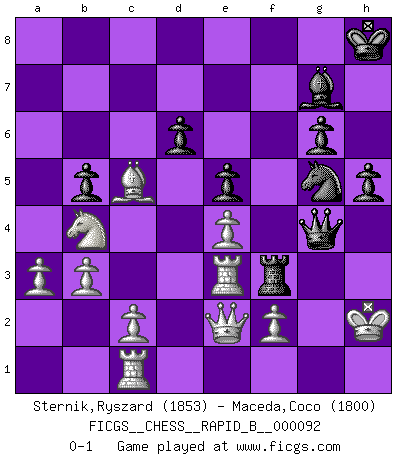 Last move : 0-1 2008 July 15 14:30:56 [Event "FICGS__CHESS__RAPID_B__000092"] [Site "FICGS"] [Date "2008.05.21"] [Round "1"] [White "Sternik,Ryszard"] [Black "Maceda,Coco"] [Result "0-1"] [WhiteElo "1853"] [BlackElo "1800"] 1.e4 c5 2.Nf3 d6 3.d4 cxd4 4.Nxd4 Nf6 5.Nc3 g6 6.g3 Nc6 7.Nde2 Bg7 8.Bg2 O-O 9.O-O Bd7 10.h3 Rc8 11.Be3 Na5 12.b3 Qc7 13.Bd4 e5 14.Be3 b5 15.a3 a6 16.Qd2 Be6 17.Rac1 Qd7 18.Rfd1 Nb7 19.g4 Kh8 20.Kh2 h5 21.g5 Nh7 22.Nd5 Qd8 23.Nb4 f6 24.h4 fxg5 25.hxg5 Bg4 26.Nxa6 Qd7 27.Re1 Bf3 28.Bh3 Bg4 29.Ng1 Bxh3 30.Nxh3 Ra8 31.Nb4 Rf3 32.Ng1 Raf8 33.Re2 Nc5 34.Bxc5 R8f4 35.Nxf3 Rxf3 36.Re3 Nxg5 37.Qe2 Qg4 0-1 Sicilian : Dragon variation Kingside Castling by player Black (move 8) Kingside Castling by player White (move 9) Player Black won this chess game. Follow this game move after move (download)Chess books should be used as we use glasses: to assist the sight, although some players make use of them as if they thought they conferred sight. (Jose Raul Capablanca) Wenn sie aufgeben, dann danke ich Ihnen für das Spiel (Eventualzug beim Fernschach). (Anonymous) Debemos de asegurarnos de que el Ajedrez no se convierta en un lenguaje muerto, muy interesante, pero tan solo para un grupo muy pequeño. (Sytze Faber) Vouloir jouer aux échecs contre soi-même est aussi paradoxal que vouloir marcher sur son ombre. (Stefan Zweig) Who needs drugs and alcohol if he can play Big Chess at FICGS ? (Heinz-Georg Lehnhoff)