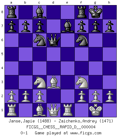 Last move : 0-1 2008 July 12 14:53:22 [Event "FICGS__CHESS__RAPID_D__000004"] [Site "FICGS"] [Date "2008.05.21"] [Round "1"] [White "Janse,Japie"] [Black "Zaichenko,Andrey"] [Result "0-1"] [WhiteElo "1488"] [BlackElo "1471"] 1.e4 e5 2.Nf3 Nf6 3.d4 Nxe4 4.dxe5 d6 5.exd6 Qxd6 6.Bd3 Nf6 7.O-O Be7 8.Re1 O-O 9.Nc3 Nc6 0-1 This chess game has been lost on time (started : 2008.05.21 17:48:28) Petrov : Modern attack, Symmetrical variation Kingside Castling by player White (move 7) Kingside Castling by player Black (move 8) Player Black won this chess game. Follow this game move after move (download)I know people who have all the will in the world, but still can't play good Chess. (Bobby Fischer) Aljechin war kein Nazi. Er war ein Opportunist. Ein schrecklicher Mann. Er liebte Geld über alles und würde für Geld ein Jude, ein Katolik oder ein Protestant werden. (Miguel Najdorf) Cuando veas una buena jugada, trata de encontrar otra mejor. (Emanuel Lasker) Comme les marins qui ont mille raisons différentes d'aller en mer, les joueurs d'échecs en ont tout autant avant de s'installer devant une table et jouer... (Vincent Bertignac, philosophe) Art disturbs, science reassures. (Georges Braque, Le Jour et la Nuit)