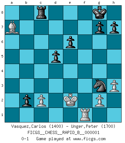 Last move : 0-1 2006 May 13 21:26:14 [Event "FICGS__CHESS__RAPID_B__000001"] [Site "FICGS"] [Date "2006.04.14"] [Round "1"] [White "Vasquez,Carlos"] [Black "Unger,Peter"] [Result "0-1"] [WhiteElo "1400"] [BlackElo "1700"] 1.e4 c5 2.d4 cxd4 3.Qxd4 Nc6 4.Qd1 Nf6 5.Nc3 e6 6.Nf3 Bc5 7.h3 d5 8.e5 Nd7 9.Bf4 Qb6 10.Qd2 Bxf2+ 11.Qxf2 Qxb2 12.Rb1 Qxc3+ 13.Qd2 Qxd2+ 14.Kxd2 O-O 15.Bb5 Nc5 16.Bxc6 bxc6 17.Be3 Ne4+ 18.Ke1 Ba6 19.Nd4 c5 20.Nc6 f6 21.Bf4 fxe5 22.Bxe5 Rf7 23.Rb3 Bc4 24.Rf3 Rb7 25.Rb3 Bxb3 26.axb3 Rc8 27.Nxa7 Rxa7 28.Rf1 c4 29.Bd4 cxb3 30.Bxa7 b2 31.Ke2 Ng3+ 0-1 Sicilian : Smith-Morra gambit Kingside Castling by player Black (move 14) Player Black won this chess game. Follow this game move after move (download)You know you're going to lose. Even when I was ahead I knew I was going to lose. - On playing against Fischer. (Andrew Soltis) Karpov ist ein Museumsstück. (Garry Kasparov) Cada Peón es potencialmente una Reina. (James Mason) Le succès, c'est être capable d'aller d'échec en échec sans perdre son enthousiasme. (Winston Churchill) He who fights with monsters should be careful lest he thereby become a monster. (Friedrich Nietzsche, Beyond Good and Evil)