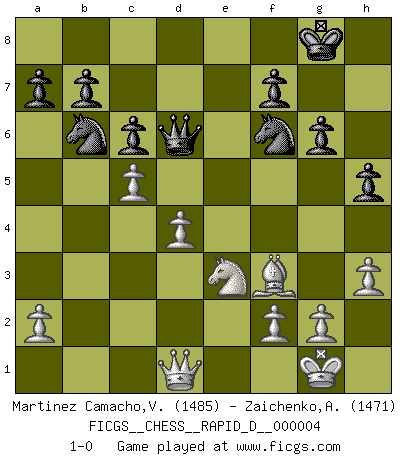 Last move : 1-0 2008 July 8 21:52:26 [Event "FICGS__CHESS__RAPID_D__000004"] [Site "FICGS"] [Date "2008.05.21"] [Round "1"] [White "Martinez Camacho,Victor Hugo"] [Black "Zaichenko,Andrey"] [Result "1-0"] [WhiteElo "1485"] [BlackElo "1471"] 1.e4 e5 2.Nf3 Nf6 3.Nxe5 d6 4.Nf3 Nxe4 5.d4 Nf6 6.Bd3 Bg4 7.O-O Be7 8.Nc3 O-O 9.Bg5 Nfd7 10.Bxe7 Qxe7 11.Re1 Qd8 12.Be2 Nf6 13.h3 Bxf3 14.Bxf3 d5 15.Qd2 c6 16.Ne2 Nbd7 17.Ng3 Re8 18.Rxe8+ Qxe8 19.Re1 Qd8 20.c3 Qb6 21.Nf5 Re8 22.Rxe8+ Nxe8 23.Qe2 Qd8 24.b3 Nef6 25.c4 dxc4 26.bxc4 g6 27.Ne3 h5 28.Qc2 Nb6 29.Qd1 Qd6 30.c5 1-0 Petrov : Classical attack, close variation Kingside Castling by player White (move 7) Kingside Castling by player Black (move 8) Player White won this chess game. Follow this game move after move (download)Those who say they understand Chess, understand nothing. (Robert Hubner) Das ganze Leben mit einer Ehefrau ist wie ein Endspiel mit ungleichfarbigen Läufern. (Viktor Kortschnoi) Entre mas años cumplo, mas valoro los Peones. (Keres) Aidez vos pièces, elles vous aideront. (Paul Morphy) It's not a bug - it's an undocumented feature. (Anonymous)