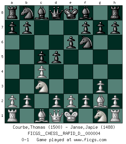Last move : 0-1 2008 June 7 12:40:28 [Event "FICGS__CHESS__RAPID_D__000004"] [Site "FICGS"] [Date "2008.05.21"] [Round "1"] [White "Courbe,Thomas"] [Black "Janse,Japie"] [Result "0-1"] [WhiteElo "1500"] [BlackElo "1488"] 1.c4 c5 2.Nc3 e6 3.g3 d5 4.Bg2 Nf6 0-1 English : Symmetrical variation Player Black won this chess game. Follow this game move after move (download)A good player is always lucky. (Jose Raul Capablanca) Ich könnte leicht behaupten: Ja,ja, Leonid Breschnew wollte nicht, daß ich Weltmeister werde. In der Tat war die Sache komplizierter. (Viktor Kortschnoi) El Ajedrez no es como la vida... ¡tiene reglas!. (Mark Pasternak) Le pion, dans sa simplicité, marche droit devant lui, mais lorsqu'il prend, il le fait obliquement? Ainsi l'homme, tant qu'il reste pauvre, marche dans la droiture et vit honnêtement, mais lorsqu'il recherche les honneurs, il flatte, se parjure et, par les voies obliques, cherche une position supérieure sur l'échiquier du monde. (Jean de Galles) When I took office, only high energy physicists had ever heard of what is called the World Wide Web... Now even my cat has its own page. (Bill Clinton, 1996)