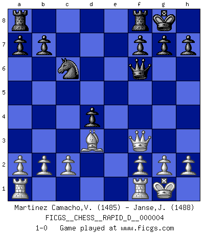 Last move : 1-0 2008 July 16 15:11:44 [Event "FICGS__CHESS__RAPID_D__000004"] [Site "FICGS"] [Date "2008.05.21"] [Round "1"] [White "Martinez Camacho,Victor Hugo"] [Black "Janse,Japie"] [Result "1-0"] [WhiteElo "1485"] [BlackElo "1488"] 1.e4 c5 2.Nc3 e6 3.Nf3 d5 4.exd5 exd5 5.d4 Nf6 6.Bb5+ Bd7 7.Qe2+ Be7 8.Bg5 O-O 9.O-O cxd4 10.Bxf6 Bxf6 11.Nxd5 Nc6 12.Nxf6+ Qxf6 13.Bd3 Bg4 14.Qd1 Bxf3 15.Qxf3 1-0 This chess game has been lost on time (started : 2008.05.21 17:48:28) Sicilian : Closed Kingside Castling by player Black (move 8) Kingside Castling by player White (move 9) Player White won this chess game. Follow this game move after move (download)There is only one thing Fischer does in Chess without pleasure: to lose ! (Boris Spassky) Unter Putin wird alles Geld aus Russland wie von einem Staubsauger nach Moskau umgeleitet, das ist wie ein schwarzes Loch. (Garry Kasparov) El pensamiento metódico es mas útil en el Ajedrez que la inspiración. (C. J. S. Purdy) Les Cavaliers se révèlent fort utiles dans les positions fermées. D'habitude, les Fous sont un peu plus forts que les Cavaliers dans les positions ouvertes. Qu'on le veuille ou non, il restera toujours des exceptions ! Fear is the path to the dark side. Fear leads to anger; anger leads to hate; hate leads to suffering. I sense much fear in you. (Master Yoda in Star Wars ep.1)