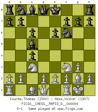 Last move : 0-1 2008 June 8 9:46:59 [Event "FICGS__CHESS__RAPID_D__000004"] [Site "FICGS"] [Date "2008.05.21"] [Round "1"] [White "Courbe,Thomas"] [Black "Hess,Volker"] [Result "0-1"] [WhiteElo "1500"] [BlackElo "1307"] 1.c4 c6 2.Nc3 Nf6 3.g3 d5 4.Bg2 dxc4 5.Nf3 e6 6.O-O Bc5 0-1 English : Caro-Kann defensive system Kingside Castling by player White (move 6) Player Black won this chess game. Follow this game move after move (download)When I asked Fischer why he had not played a certain move in our game, he replied: 'Well, you laughed when I wrote it down !' (Mikhail Tal) Darum geht es im Schach. Einen Tag gibst du deinem Gegner eine Lektion, am nächsten Tag gibt er dir eine. (Robert James Fischer) El juego de Fischer siempre fue nítido, racional y brillante. Uno de los mejores por siempre. (Dave Regis) Nous sommes les pions de la mystérieuse partie d'Echecs jouée par Dieu. Il nous déplace, nous arrête, nous pousse encore, puis nous lance un à un dans la boîte du Néant. Epitaphe sur la tombe de David Janowsky (1868-1927). When you don't know what to do, walk fast and look worried. (Anonymous)