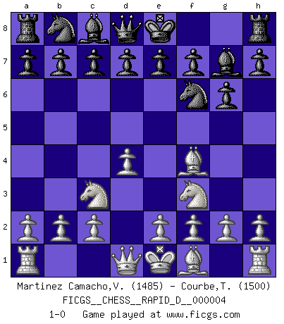 Last move : 1-0 2008 June 8 9:47:23 [Event "FICGS__CHESS__RAPID_D__000004"] [Site "FICGS"] [Date "2008.05.21"] [Round "1"] [White "Martinez Camacho,Victor Hugo"] [Black "Courbe,Thomas"] [Result "1-0"] [WhiteElo "1485"] [BlackElo "1500"] 1.d4 g6 2.Nf3 Bg7 3.Nc3 Nf6 4.Bf4 1-0 Modern defense Player White won this chess game. Follow this game move after move (download)One of these modest little moves may be more embarrassing to your opponent than the biggest threat. (Siegbert Tarrasch) Wenn ich einen Club besuche, sind die Spieler stumm vor Staunen. (José Raúl Capablanca) El juego de Damas es para vagabundos. (Paul Morphy) En blitz, le Cavalier l'emporte sur le Fou. (Vlastimil Hort) 'preceded by its own quotation yields a falsehood' preceded by its own quotation yields a falsehood. (W. V. O. Quine - Set Theory And Its Logic, 1953)