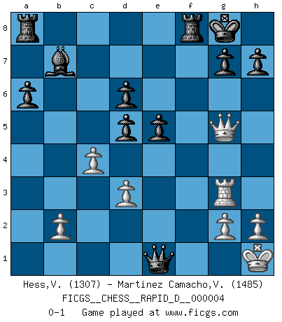Last move : 0-1 2008 June 9 20:45:54 [Event "FICGS__CHESS__RAPID_D__000004"] [Site "FICGS"] [Date "2008.05.21"] [Round "1"] [White "Hess,Volker"] [Black "Martinez Camacho,Victor Hugo"] [Result "0-1"] [WhiteElo "1307"] [BlackElo "1485"] 1.e4 e5 2.Nf3 Nc6 3.Bb5 a6 4.Ba4 Nf6 5.d3 Be7 6.O-O b5 7.Bb3 d6 8.Ng5 O-O 9.c4 Nd4 10.Nc3 Nxb3 11.axb3 bxc4 12.bxc4 Bb7 13.Nd5 Nxd5 14.Qh5 Bxg5 15.Bxg5 f6 16.exd5 fxg5 17.Rae1 c6 18.Re3 Qe8 19.Qxg5 cxd5 20.Rg3 Qf7 21.Re1 Qxf2+ 22.Kh1 Qxe1+ 0-1 Ruy Lopez : Anderssen variation Kingside Castling by player White (move 6) Kingside Castling by player Black (move 8) Player Black won this chess game. Follow this game move after move (download)Even the laziest King flees wildly in the face of a double check ! (Aaron Nimzowitsch) Fischer machte Schach einfach zu einer aufregenden Sache, wann immer er sich ans Brett setzte. (Raymond Keene) Uno no tiene que jugar muy bien, es suficiente jugar mejor que el oponente. (Siegbert Tarrasch) Soyez une menace à chaque fois que vous vous asseyez pour jouer. (Ken Smith) A shortcut is the longest distance between two points. (Don Groves)