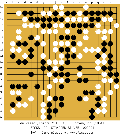 Last move : 1-0 2008 August 1 3:58:25 [Event "FICGS__GO__STANDARD_SILVER__000001"] [Site "FICGS"] [Date "2008.05.21"] [Round "1"] [Black "de Vassal,Thibault"] [White "Groves,Don"] [Result "1-0"] [Rating 1 "2363"] [Rating 2 "1364"] 1.q4 d17 2.c4 e4 3.q17 c3 4.b3 d3 5.d6 b2 6.c10 o4 7.k4 q6 8.p5 r3 9.q3 r4 10.o5 q5 11.n4 r14 12.r12 r17 13.r16 q16 14.s16 s17 15.p16 q15 16.q18 s15 17.s18 r15 18.r18 t16 19.r9 r7 20.s8 s7 21.t7 t6 22.t8 j3 23.k3 l17 24.j17 o17 25.p17 k16 26.f17 c15 27.e18 c12 28.d18 c18 29.b11 b12 30.h3 g3 31.j4 h4 32.h2 g2 33.h1 g1 34.j2 c5 35.c6 b5 36.b6 j16 37.h16 h15 38.g16 g15 39.o16 n17 40.s13 o14 41.n15 o15 42.n16 o19 43.m14 n13 44.m13 m12 45.k14 j15 46.k12 o12 47.k17 l15 48.m16 m17 49.l16 k18 50.j18 k19 51.m18 j19 52.l18 h18 53.h17 n18 54.p18 f16 55.g17 g18 56.e17 d16 57.o18 q12 58.q11 p12 59.e11 d11 60.d10 k13 61.e8 h6 62.e12 e16 63.e14 f14 64.d13 c14 65.f6 g5 66.l14 j13 67.c13 b13 68.l12 l13 69.m11 n11 70.l10 h8 71.l8 j12 72.k6 q10 73.s11 r10 74.s10 q9 75.o7 r8 76.s9 n8 77.n7 k11 78.l11 k10 79.k9 j9 80.j8 h10 81.g10 g11 82.g9 j7 83.k8 k7 84.l7 q2 85.p2 r2 86.p1 s5 87.f13 g13 88.h9 j10 89.n9 r11 90.r13 1-0 Comment by player 1 : Thibault de Vassal : Thanks for the game ! :) Here are the names of the openings (joseki) played in the four corners : Corner d4 : c4 e4 Komoku (Somok, Xiao~mu`) 3-4 Point. The komoku (3-4) point is the traditional corner enclosure move.. Ikken Takagakari (Hankan Nop'dakeolch'im, Yi Gaogua`jiao~, 1-Space High Approach). The 5-4 approach move has become more popular in modern times, as modern Go emphasizes speed and influence. Corner q4 : q4 o4 Hoshi (Hwajeom, Seongjeom, Xingwei`) 4-4 Point. The star or hoshi (4-4) point, emphasizing influence at the potential expense of territory. Ikken Takagakari (Hankan Nop'dakeolch'im, Yi Gaojia, 1-Space High Approach). Black typically responds at 6-4 or 3-10. Black 4-10 is played when Black finds play on the right side advantageous. Black 4-8 or 3-8 may be played when Black has support at top. Corner q16 : q17 r14 Komoku (Somok, Xiao~mu`) 3-4 Point. The komoku (3-4) point is the traditional corner enclosure move.. Nikken Kakari (Dukan Keolch'im, E`r Gua`jiao~, 2-Space Low Approach). White 2 is used with friendly forces backing it up. Its purpose is to prevent a pincer. Locally it results in a loss, but may be appropriate fuseki strategy. It was popular in the late 1950s and early 1960s, but is not seen often nowadays, having been replaced by the one-space high approach, with which it has points in common. Corner d16 : d17 j17 Komoku (Somok, Xiao~mu`) 3-4 Point. The komoku (3-4) point is the traditional corner enclosure move.. Player Black won this Go (weiqi, baduk) game. Follow this game move after move (download)With only one group, you will win. (Anonymous) Good decisions come from experience, and experience comes from bad decisions. (Anonymous)