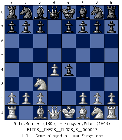 Last move : 1-0 2008 August 18 6:22:13 [Event "FICGS__CHESS__CLASS_B__000047"] [Site "FICGS"] [Date "2008.05.22"] [Round "1"] [White "Alic,Muamer"] [Black "Fenyves,Adam"] [Result "1-0"] [WhiteElo "1800"] [BlackElo "1843"] 1.e4 d5 2.d4 dxe4 3.Nc3 1-0 This chess game has been lost on time (started : 2008.05.22 1:25:36) Scandinavian (centre counter) defense Player White won this chess game. Follow this game move after move (download)Could we look into the head of a Chess player, we should see there a whole world of feelings, images, ideas, emotion and passion. (Alfred Binet) Ein Großmeister muß tausende Partien in seinem Kopf speichern, denn diese sind für Ihn, was die Worte der Muttersprache für gewöhnliche Leute sind, oder Noten für Musiker... (Garry Kasparov) Debes de llevar a tu oponente hacia un profundo y obscuro bosque donde 2+2=5, y el camino que conduce a la salida es suficientemente ancho para solamente uno. (Mikhail Tal) Fischer est le meilleur joueur du monde et Karpov n'est qu'un joueur de bistrot. (Garry Kasparov, agé de 16 ans) Knowledge rests not upon truth alone, but upon error also. (Carl G. Jung)