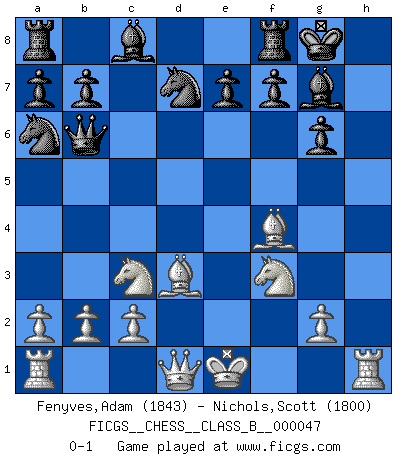 Last move : 0-1 2008 August 20 6:39:56 [Event "FICGS__CHESS__CLASS_B__000047"] [Site "FICGS"] [Date "2008.05.22"] [Round "1"] [White "Fenyves,Adam"] [Black "Nichols,Scott"] [Result "0-1"] [WhiteElo "1843"] [BlackElo "1800"] 1.e4 d6 2.d4 Nf6 3.Nc3 g6 4.f4 Bg7 5.Nf3 O-O 6.Bd3 Na6 7.e5 Nd7 8.h4 c5 9.h5 cxd4 10.Nxd4 dxe5 11.Nf3 exf4 12.hxg6 hxg6 13.Bxf4 Qb6 0-1 Pirc : Austrian attack, 6.Bd3 Kingside Castling by player Black (move 5) Player Black won this chess game. Follow this game move after move (download)Help your pieces so they can help you. (Paul Morphy) Kritik überlasse ich den Spießern. Ich zeige nichts, wofür ich mich schämen muss. (Alexandra Kosteniuk) El Ajedrez es una manera fabulosa para que los niños aprendan a autovalorarse y a autoestimarse. (Saudin Robovic) Aux échecs, les retours au sommet sont rares : les dommages psychologiques consécutifs à une défaite sont trop sévères. (Daily Telegraph) See no evil, hear no evil, speak no evil. (The 3 monkeys)