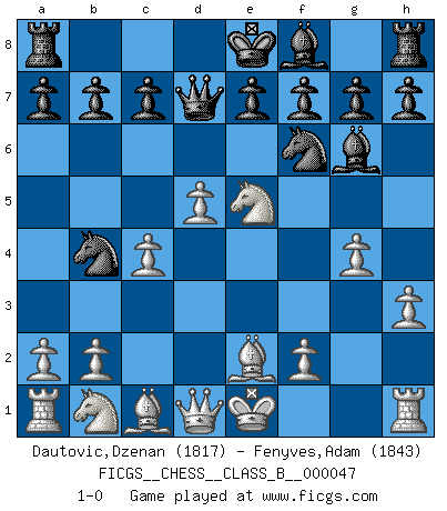 Last move : 1-0 2008 August 1 16:53:17 [Event "FICGS__CHESS__CLASS_B__000047"] [Site "FICGS"] [Date "2008.05.22"] [Round "1"] [White "Dautovic,Dzenan"] [Black "Fenyves,Adam"] [Result "1-0"] [WhiteElo "1817"] [BlackElo "1843"] 1.e4 d5 2.exd5 Qxd5 3.Nf3 Nf6 4.d4 Bg4 5.Be2 Nc6 6.h3 Bh5 7.c4 Qd7 8.g4 Bg6 9.d5 Nb4 10.Ne5 1-0 This chess game has been lost on time (started : 2008.05.22 1:25:36) Scandinavian (centre counter) defense Player White won this chess game. Follow this game move after move (download)Some part of a mistake is always correct. (Savielly Tartakover) Die Auseinandersetzung mit Karpow war politisch geprägt. Er stand für das kommunistische System, wurde von dessen Repräsentanten gehätschelt. Ich war der Oppositionelle. Jeder Schachweltmeister spiegelt auch die gesellschaftlichen Verhältnisse wider. Kramnik steht für die Börsen-Generation des Neuen Markts, ideologiefrei, zahlenfixiert. (Garry Kasparov) En el Ajedrez, cuando menos, el valiente hereda la tierra. (Edmar Mednis) Les Echecs sont affaire de jugement sensible. Savoir quand frapper et quand esquiver. (Fischer) God is an atheist. (Unknown)