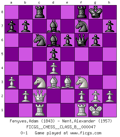 Last move : 0-1 2008 August 20 18:40:15 [Event "FICGS__CHESS__CLASS_B__000047"] [Site "FICGS"] [Date "2008.05.22"] [Round "1"] [White "Fenyves,Adam"] [Black "Nent,Alexander"] [Result "0-1"] [WhiteElo "1843"] [BlackElo "1957"] 1.e4 e6 2.d4 d5 3.e5 c5 4.c3 Nc6 5.Nf3 Nh6 6.Bd3 cxd4 7.cxd4 f6 8.O-O Nf7 9.exf6 Qxf6 10.Be3 Bd6 11.Nc3 O-O 12.Qc2 g6 13.a3 Bd7 14.Rac1 Rac8 0-1 French : Advance, Paulsen attack Kingside Castling by player White (move 8) Kingside Castling by player Black (move 11) Player Black won this chess game. Follow this game move after move (download)The Chess pieces are the block alphabet which shapes thoughts; and these thoughts, although making a visual design on the chessboard, express their beauty abstractly, like a poem. (Marcel Duchamp) Aljechin war kein Nazi. Er war ein Opportunist. Ein schrecklicher Mann. Er liebte Geld über alles und würde für Geld ein Jude, ein Katolik oder ein Protestant werden. (Miguel Najdorf) Preferería tener un Peón que un dedo. (Reuben Fine) Toutes les manuvres exécutées sur une colonne ouverte ont pour but ultime l'intrusion définitive sur la septième ou la huitième rangée, en plein cur de la position ennemie. (Aaron Nimzovitch) You can only get smarter by playing a smarter opponent. (Revolver, movie)