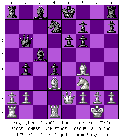 Last move : 1/2-1/2 2006 October 6 12:55:25 [Event "FICGS__CHESS__WCH_STAGE_1_GROUP_18__000001"] [Site "FICGS"] [Date "2006.07.19"] [Round "1"] [White "Ergen,Cenk"] [Black "Nucci,Luciano"] [Result "1/2-1/2"] [WhiteElo "1700"] [BlackElo "2057"] 1.d4 d5 2.c4 e6 3.Nf3 Nf6 4.Nc3 c6 5.e3 Nbd7 6.Bd3 dxc4 7.Bxc4 b5 8.Bd3 a6 9.e4 c5 10.e5 cxd4 11.Nxb5 axb5 12.exf6 gxf6 13.O-O Qb6 14.Qe2 b4 15.Rd1 Bc5 16.Bf4 1/2-1/2 Queen's gambit declined Kingside Castling by player White (move 13) This chess game ended in a draw. Follow this game move after move (download)Chess is the art of analysis. (Mikhail Botvinnik) Wir irren allesamt, nur jeder irrt anders. (Georg Christoph Lichtenberg) Prefiero perder una partida realmente buena, que ganar una mala. (David Levy) La guerre est enfant de la passion, la passion est enfant du narcissisme et le narcissisme est l'enfant. (...) Une autre partie ? (Thibault de Vassal) Once you start thinking you have nothing left to learn, you have everything to learn. (Steve Badget)