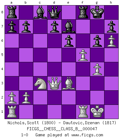 Last move : 1-0 2008 August 17 6:13:37 [Event "FICGS__CHESS__CLASS_B__000047"] [Site "FICGS"] [Date "2008.05.22"] [Round "1"] [White "Nichols,Scott"] [Black "Dautovic,Dzenan"] [Result "1-0"] [WhiteElo "1800"] [BlackElo "1817"] 1.e4 c5 2.d4 cxd4 3.c3 dxc3 4.Nxc3 Nc6 5.Nf3 e6 6.Bd3 Nge7 7.Bg5 f6 8.Be3 Ng6 9.O-O Be7 10.h4 O-O 11.h5 Nge5 12.Nxe5 Nxe5 13.h6 g6 14.f4 Nxd3 15.Qxd3 f5 16.exf5 Rxf5 17.g4 Rf8 18.f5 1-0 This chess game has been lost on time (started : 2008.05.22 1:25:36) Sicilian : Smith-Morra gambit Kingside Castling by player White (move 9) Kingside Castling by player Black (move 10) Player White won this chess game. Follow this game move after move (download)The winner of the game is the player who makes the next-to-last mistake. (Savielly Tartakover) Verschiedene, sehr schätzbare und im Laufe des Lebens nützliche Eigenschaften des Geistes können durch das Schachspiel erworben und gekräftigt werden, so dass sie zu Gewohnheiten werden, die uns nie im Stich lassen. (Benjamin Franklin) Cuando le juegas a Fischer, no es una cuestion de si vas a ganar o perder. Es una cuestion de si vas a sobrevivir. (Boris Spassky) Les Cavaliers se révèlent fort utiles dans les positions fermées. D'habitude, les Fous sont un peu plus forts que les Cavaliers dans les positions ouvertes. Qu'on le veuille ou non, il restera toujours des exceptions ! Patience, use the Force, think ! (Obi-Wan Kenobi in Star Wars ep.2)