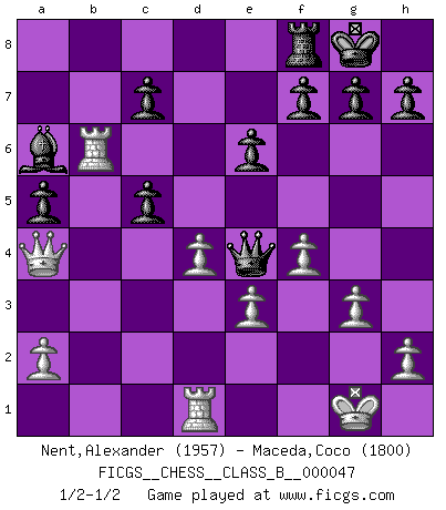 Last move : 1/2-1/2 2008 July 28 13:49:51 [Event "FICGS__CHESS__CLASS_B__000047"] [Site "FICGS"] [Date "2008.05.22"] [Round "1"] [White "Nent,Alexander"] [Black "Maceda,Coco"] [Result "1/2-1/2"] [WhiteElo "1957"] [BlackElo "1800"] 1.Nf3 Nf6 2.c4 e6 3.g3 d5 4.d4 dxc4 5.Bg2 Nc6 6.Qa4 Bb4+ 7.Bd2 Nd5 8.Bxb4 Ndxb4 9.O-O Rb8 10.Nc3 a6 11.Ne5 O-O 12.Bxc6 Nxc6 13.Nxc6 bxc6 14.Qxc4 Qd6 15.e3 Rxb2 16.Rab1 Rb6 17.f4 a5 18.Qa4 Ba6 19.Rfd1 c5 20.Ne4 Qd5 21.Rxb6 Qxe4 1/2-1/2 Reti Opening Kingside Castling by player White (move 9) Kingside Castling by player Black (move 11) This chess game ended in a draw. Follow this game move after move (download)Life is like a game of Chess, changing with each move. (Chinese proverb) Im Schach gewinnt jeder. Hat man Freunde am Spiel - und das ist die Hauptsache - ist auch der Verlust einer Partie kein Unglück. (David Bronstein) Robert Fischer es la ley hacia si mismo. (Larry Evans) Aux échecs, l'amour-propre est satisfait quand on remporte la victoire, mais il n'y a pas de honte à être battu. (Benjamin Franklin) The problem with manipulation is that people can turn on you. (Horatio Caine, C.S.I. Miami)