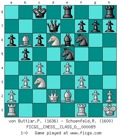 Last move : 1-0 2008 June 8 11:3:1 [Event "FICGS__CHESS__CLASS_D__000089"] [Site "FICGS"] [Date "2008.05.23"] [Round "1"] [White "von Buttlar,Paul"] [Black "Schoenfeld,Ralf"] [Result "1-0"] [WhiteElo "1636"] [BlackElo "1600"] 1.c4 e5 2.Nc3 c6 3.e4 Bc5 4.Nf3 d6 5.d4 exd4 6.Nxd4 Nf6 7.Be2 Qe7 8.f3 a6 9.Be3 Nbd7 10.Qd2 Ne5 11.O-O Be6 12.b3 Ba7 13.Kh1 O-O-O 14.Nf5 Qd7 15.Bxa7 b5 16.Bb6 Rde8 17.Nxd6+ 1-0 English Opening Kingside Castling by player White (move 11) Queenside Castling by player Black (move 13) Player White won this chess game. Follow this game move after move (download)One doesn't have to play well, it's enough to play better than your opponent. (Siegbert Tarrasch) Dieses schreckliche Gefühl, dass ich gegen eine Maschine spielte, die niemals Fehler macht, zerschmetterte meinen Widerstand. (Mark Taimanov) Fischer era un maestro de claridad y un Rey del posicionamiento astuto. Sus oponentes podían ver hacia donde se dirigía pero eran impotentes para detenerlo. (Bruce Pandolfini) Votre seul travail dans les ouvertures est d'obtenir un milieu de partie jouable. (Lajos Portish) Those parts of the system that you can hit with a hammer (not advised) are called hardware; those program instructions that you can only curse at are called software. (Anonymous)