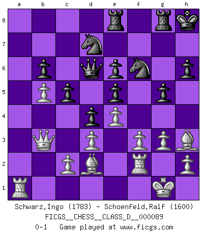 Last move : 0-1 2008 August 25 7:13:8 [Event "FICGS__CHESS__CLASS_D__000089"] [Site "FICGS"] [Date "2008.05.23"] [Round "1"] [White "Schwarz,Ingo"] [Black "Schoenfeld,Ralf"] [Result "0-1"] [WhiteElo "1783"] [BlackElo "1600"] 1.g3 e5 2.Bg2 d5 3.f3 Nf6 4.Nh3 Bc5 5.Nf2 c6 6.d3 Qb6 7.O-O h6 8.Nc3 Be6 9.Na4 Bxf2+ 10.Rxf2 Qc7 11.Nc5 b6 12.Nxe6 fxe6 13.Bd2 Nbd7 14.e4 d4 15.b4 O-O 16.Qb1 c5 17.Qb3 Qd6 18.Bh3 Rae8 19.b5 Kh8 20.a4 g5 21.a5 Rg8 22.axb6 axb6 0-1 Benko's Opening Kingside Castling by player White (move 7) Kingside Castling by player Black (move 15) Player Black won this chess game. Follow this game move after move (download)Kasparov : J'adoube , Ivanchuk : S'il vous plaît ! (Garry Kasparov & Vassily Ivanchuk, Linares 1997) Wie ich sie so einen nach dem anderen nieder mähte wurde meine Überlegenheit offensichtlich. (José Raúl Capablanca) Cuando le juegas a Fischer, no es una cuestion de si vas a ganar o perder. Es una cuestion de si vas a sobrevivir. (Boris Spassky) Les échecs c'est le défi de l'alpiniste, toujours plus haut, prêt à tout pour monter à l'assaut du Roi ennemi. Les échecs, c'est de la musique en mouvement, un ballet majestueux pour les yeux. C'est de la poésie composée par les fantômes du passé qui au même titre que Rimbaud ou Verlaine méritent notre admiration. Les échecs, c'est de la peinture ou le moindre mouvement modifie le tableau pour en faire un Picasso ou un Van Gogh. Les échecs, c'est tout et rien, c'est la vie et la mort. Jjulie33 sur le forum de France-Echecs. Internal peace cannot coexist with external war. (Don Groves)