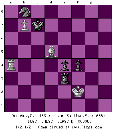 Last move : 1/2-1/2 2009 February 11 11:34:33 [Event "FICGS__CHESS__CLASS_D__000089"] [Site "FICGS"] [Date "2008.05.23"] [Round "1"] [White "Denchev,Stanimir"] [Black "von Buttlar,Paul"] [Result "1/2-1/2"] [WhiteElo "1531"] [BlackElo "1636"] 1.d4 d5 2.c4 c6 3.Nf3 e6 4.Nc3 Nf6 5.Bg5 Bd6 6.e4 dxe4 7.Bxf6 Qxf6 8.Nxe4 Qe7 9.Nxd6+ Qxd6 10.c5 Qc7 11.Bd3 Nd7 12.O-O Nf6 13.Qe2 O-O 14.Rfd1 b6 15.Ne5 Nd7 16.Qh5 Nf6 17.Qf3 bxc5 18.Qxc6 Qxc6 19.Nxc6 cxd4 20.Nxd4 Bb7 21.Rac1 Rac8 22.Rxc8 Rxc8 23.Nb5 Bd5 24.Nc3 g6 25.Ba6 Rc5 26.Nxd5 Nxd5 27.a3 Kf8 28.Kf1 Ke7 29.g3 Nc7 30.Bd3 e5 31.Ke2 Ne6 32.Ke3 f5 33.f3 Nc7 34.h4 Nd5+ 35.Kf2 a5 36.h5 Nf6 37.hxg6 hxg6 38.b4 axb4 39.axb4 Rc3 40.b5 Rb3 41.Bc4 Rb2+ 42.Ke3 g5 43.Ra1 f4+ 44.gxf4 gxf4+ 45.Kd3 Rf2 46.Ra7+ Kd8 47.b6 Rxf3+ 48.Ke2 Re3+ 49.Kf1 Nd7 50.b7 Nb8 51.Ra5 Kc7 52.Bd5 Kd6 53.Kf2 e4 54.Ra8 Kc7 55.Ra4 Rf3+ 56.Ke2 Re3+ 57.Kf2 1/2-1/2 QGD Slav : 3.Nf3 Kingside Castling by player White (move 12) Kingside Castling by player Black (move 13) 10 pieces endgame at move 44 : White KRBPP , Black KRNPP WHITE : King + 1 Rook 1 Bishop 2 Pawns BLACK : King + 1 Rook 1 Knight 2 Pawns 9 pieces endgame at move 47 : White KRBP , Black KRNPP WHITE : King + 1 Rook 1 Bishop 1 Pawn BLACK : King + 1 Rook 1 Knight 2 Pawns This chess game ended in a draw. Follow this game move after move (download)You must take your opponent into a deep dark forest where 2+2=5, and the path leading out is only wide enough for one. (Mikhail Tal) Ich tröste mich mit dem Vergnügen, daß Schachfans, Zuschauer und Leser glücklich sind, wenn ein Großmeister etwas riskiert, statt nur Klötzchen zu schieben. (Mikhail Nekhemyevich Tal) Solo puedes ser bueno en el Ajedrez si amas al juego. (Bobby Fischer) Il n'y a pas de prix trop élevé au scalp de l'ennemi. (Koblentz) Everybody lies. (Gregory House, House M.D.)