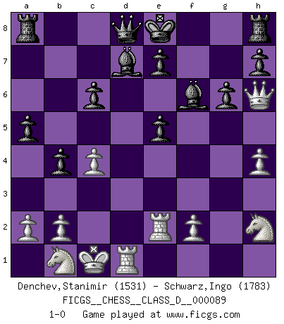 Last move : 1-0 2008 August 25 7:13:13 [Event "FICGS__CHESS__CLASS_D__000089"] [Site "FICGS"] [Date "2008.05.23"] [Round "1"] [White "Denchev,Stanimir"] [Black "Schwarz,Ingo"] [Result "1-0"] [WhiteElo "1531"] [BlackElo "1783"] 1.c4 g6 2.Nf3 Bg7 3.d4 f6 4.Bf4 Nh6 5.h4 Nf7 6.e4 d6 7.Nc3 c6 8.Qd2 Bg4 9.Nh2 Bd7 10.g4 Na6 11.Be2 Nc7 12.O-O-O b5 13.Rhe1 b4 14.Nb1 a5 15.g5 Ne6 16.gxf6 Bxf6 17.Bg3 Nxd4 18.e5 Nxe2+ 19.Rxe2 Nxe5 20.Bxe5 dxe5 21.Qh6 1-0 English Opening Queenside Castling by player White (move 12) Player White won this chess game. Follow this game move after move (download)A Chess game is a dialogue, a conversation between a player and his opponent. Each move by the opponent may contain threats or be a blunder, but a player cannot defend against threats or take advantage of blunders if he does not first ask himself: What is my opponent planning after each move ? (Bruce A. Moon) Wenn Spassky eine Figur opfert kannst du genauso gut aufgeben. Aber wenn Tal eine Figur opfert, spiel weiter. Er könnte noch eine weitere opfern, und dann ... wer weiß? (Miguel Najdorf) Aquel que toma al Peón de Caballo de la Reina, se pasará la noche a dormir en la calle. (Anónimo) Les Cavaliers se révèlent fort utiles dans les positions fermées. D'habitude, les Fous sont un peu plus forts que les Cavaliers dans les positions ouvertes. Qu'on le veuille ou non, il restera toujours des exceptions ! Heh, heh, heh. Time to abandon ship. (General Grievous in Star Wars ep.3)