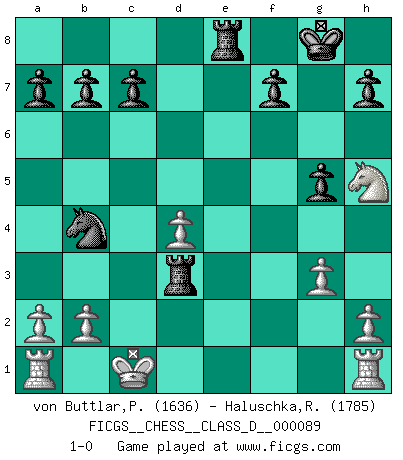 Last move : 1-0 2008 November 24 21:55:5 [Event "FICGS__CHESS__CLASS_D__000089"] [Site "FICGS"] [Date "2008.05.23"] [Round "1"] [White "von Buttlar,Paul"] [Black "Haluschka,Rainer"] [Result "1-0"] [WhiteElo "1636"] [BlackElo "1785"] 1.c4 e5 2.Nc3 Nf6 3.Nf3 Nc6 4.d4 e4 5.Ng1 Bb4 6.e3 d5 7.Bd2 O-O 8.cxd5 Nxd5 9.Nxe4 Re8 10.Bd3 Bf5 11.Qf3 Bxe4 12.Bxe4 Nxe3 13.fxe3 Qh4+ 14.g3 Qxe4 15.Qxe4 Rxe4 16.Bxb4 Nxb4 17.Kd2 Rae8 18.Ne2 Rxe3 19.Nf4 g5 20.Nh5 Rd3+ 21.Kc1 1-0 This chess game has been lost on time (started : 2008.05.23 6:4:59) English Opening Kingside Castling by player Black (move 7) Player White won this chess game. Follow this game move after move (download)The battle for the ultimate truth will never be won. And that's why Chess is so fascinating. (Hans Kmoch) Die starken Figuren des Gegners muss man abtauschen. (José Raúl Capablanca) Fischer no está bajo la obligación de nadie. (Joseph Platz) Botvinnik disait en comparant les échecs à la musique: Il existe une science dont le but est l'étude de l'acoustique et des sons. Mais il y a aussi un art qui se sert de l'océan des sons : c'est la musique. De toute évidence, il en est de même pour la pensée. La logique est l'étude des lois de la réflexion et les échecs reflètent, en tant qu'art, le côté logique de la réflexion, sous la forme d'images artistiques... Extrait de Fischer - Spassky, Reykjavik 1972 par Alexander & F. Wyndham (Ed. Solar), p 37. Somewhere in the world there is an epigram for every dilemma. (Hendrik Willem van Loon)