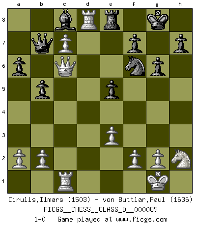 Last move : 1-0 2008 August 20 17:16:39 [Event "FICGS__CHESS__CLASS_D__000089"] [Site "FICGS"] [Date "2008.05.23"] [Round "1"] [White "Cirulis,Ilmars"] [Black "von Buttlar,Paul"] [Result "1-0"] [WhiteElo "1503"] [BlackElo "1636"] 1.d4 d5 2.c4 c6 3.Nc3 e6 4.e3 Nf6 5.Nf3 Bd6 6.Bd3 dxc4 7.Bxc4 Nbd7 8.O-O O-O 9.Bd3 c5 10.Bd2 a6 11.Rc1 b5 12.Ne4 Nxe4 13.Bxe4 Rb8 14.Qe2 Nf6 15.dxc5 Bxh2+ 16.Nxh2 Nxe4 17.Rfd1 Qc7 18.c6 e5 19.Bb4 Re8 20.Qc2 Nf6 21.Bd6 Qb6 22.Bxb8 Qxb8 23.c7 Qb7 24.Rd8 g6 25.Qc6 1-0 QGD Slav defense Kingside Castling by player White (move 8) Kingside Castling by player Black (move 8) Player White won this chess game. Follow this game move after move (download)Man is a frivolous, a specious creature, and like a Chess player, cares more for the process of attaining his goal than for the goal itself. (Dostoyevsky) Es ist wirklich schade, dass so viele Schachspieler nicht auf ihr Äußeres achten! (Alexandra Kosteniuk) Coloca el contenido del tablero de Ajedrez en un sombrero, agita las piezas vigorosamente, derrámalas en el tablero desde una altura de medio metro y así obtienes el estilo de Wilhelm Steinitz. (H. E. Bird) Il vaut mieux sacrifier les pièces de l'adversaire. (Xavier Tartacover) Always remember that you are unique; just like everyone else. (Unknown)