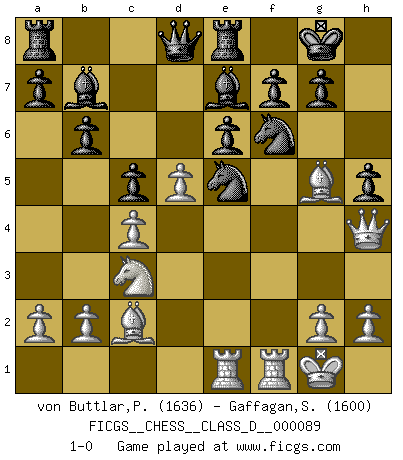 Last move : 1-0 2008 October 24 0:36:30 [Event "FICGS__CHESS__CLASS_D__000089"] [Site "FICGS"] [Date "2008.05.23"] [Round "1"] [White "von Buttlar,Paul"] [Black "Gaffagan,Steven"] [Result "1-0"] [WhiteElo "1636"] [BlackElo "1600"] 1.c4 e6 2.Nc3 d5 3.d4 Be7 4.e4 dxe4 5.f3 exf3 6.Nxf3 Nf6 7.Bd3 b6 8.O-O Bb7 9.Bc2 Nbd7 10.Qe1 O-O 11.Qh4 c5 12.Bg5 Re8 13.Ne5 h5 14.d5 Nxe5 15.Rae1 1-0 This chess game has been lost on time (started : 2008.05.23 6:4:59) English Opening Kingside Castling by player White (move 8) Kingside Castling by player Black (move 10) Player White won this chess game. Follow this game move after move (download)For me, Chess is life and every game is like a new life. Every Chess player gets to live many lives in one lifetime. (Eduard Gufeld) Das Schachspiel ist ein See, in welchem eine Mücke baden und ein Elefant ertrinken kann. (Emanuel Lasker) Fischer era un maestro de claridad y un Rey del posicionamiento astuto. Sus oponentes podían ver hacia donde se dirigía pero eran impotentes para detenerlo. (Bruce Pandolfini) Le plus grand jeu de l'esprit jamais inventé, plus vous l'apprenez, plus vous y prenez du plaisir. (Garry Kasparov) War is the child of passion, passion is the child of narcissism and narcissism is the child. (...) Another game ? (Thibault de Vassal)