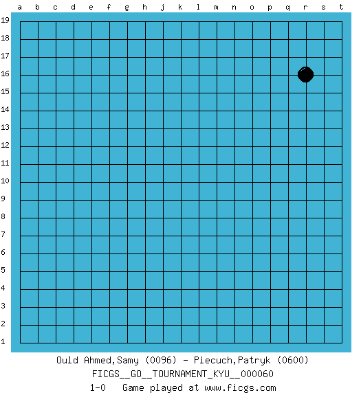 Last move : 1-0 2008 June 22 13:1:29 [Event "FICGS__GO__TOURNAMENT_KYU__000060"] [Site "FICGS"] [Date "2008.05.23"] [Round "1"] [Black "Ould Ahmed,Samy"] [White "Piecuch,Patryk"] [Result "1-0"] [Rating 1 "0096"] [Rating 2 "0600"] 1.r16 1-0 This go game has been lost on time (started : 2008.05.23 9:45:13) Here are the names of the openings (joseki) played in the four corners : Player Black won this Go (weiqi, baduk) game. Follow this game move after move (download)Proverbs do not apply to White. (Tero Sand) In fact if nothing is done against this teddy bear, hereby I announce that I would quit chess, rapid chess, blitz chess, postal chess, email chess, server chess and correspondence chess I will then switch to a table game where teddy bears aren't going to be seen for a while, like Poker, or Roulette, all 18+ games. (Elmer Valderrama)