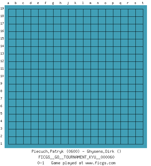 Last move : 0-1 2008 June 22 13:1:29 [Event "FICGS__GO__TOURNAMENT_KYU__000060"] [Site "FICGS"] [Date "2008.05.23"] [Round "1"] [Black "Piecuch,Patryk"] [White "Ghysens,Dirk"] [Result "0-1"] [Rating 1 "0600"] 0-1 This go game has been lost on time (started : 2008.05.23 9:45:13) Here are the names of the openings (joseki) played in the four corners : Player White won this Go (weiqi, baduk) game. Follow this game move after move (download)Pon-nuki is worth thirty points. (Anonymous) Don't be irreplaceable, if you can't be replaced, you can't be promoted. (Dan Rotaru)