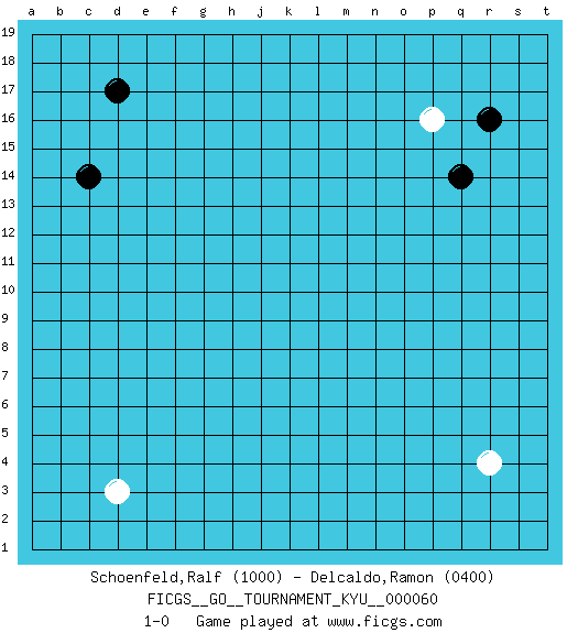 Last move : 1-0 2008 May 27 16:4:50 [Event "FICGS__GO__TOURNAMENT_KYU__000060"] [Site "FICGS"] [Date "2008.05.23"] [Round "1"] [Black "Schoenfeld,Ralf"] [White "Delcaldo,Ramon"] [Result "1-0"] [Rating 1 "1000"] [Rating 2 "0400"] 1.r16 d3 2.d17 r4 3.c14 p16 4.q14 1-0 Here are the names of the openings (joseki) played in the four corners : Corner q16 : r16 p16 Komoku (Somok, Xiao~mu`) 3-4 Point. The komoku (3-4) point is the traditional corner enclosure move.. Ikken Takagakari (Hankan Nop'dakeolch'im, Yi Gaogua`jiao~, 1-Space High Approach). The 5-4 approach move has become more popular in modern times, as modern Go emphasizes speed and influence. Player Black won this Go (weiqi, baduk) game. Follow this game move after move (download)Go is not a blocking game, it's a game of action. (Pierre Audouard) Don't be discouraged. It's often the last key in the bunch that opens the lock. (Author unknown)