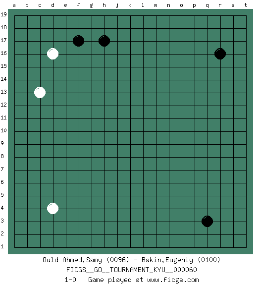 Last move : 1-0 2008 July 17 15:14:18 [Event "FICGS__GO__TOURNAMENT_KYU__000060"] [Site "FICGS"] [Date "2008.05.23"] [Round "1"] [Black "Ould Ahmed,Samy"] [White "Bakin,Eugeniy"] [Result "1-0"] [Rating 1 "0096"] [Rating 2 "0100"] 1.r16 d4 2.q3 d16 3.f17 c13 4.h17 1-0 This go game has been lost on time (started : 2008.05.23 9:45:13) Here are the names of the openings (joseki) played in the four corners : Corner d16 : d16 f17 Hoshi (Hwajeom, Seongjeom, Xingwei`) 4-4 Point. The star or hoshi (4-4) point, emphasizing influence at the potential expense of territory. Ikken Kakari (Hankan Keolch'im, Yi Gua`jiao~, 1-Space Low Approach). Black 2 is the standard approach move to the 4-4. Player Black won this Go (weiqi, baduk) game. Follow this game move after move (download)If there is no stone on the handicap point, the carpenter's square is dead. (Anonymous) Nothing is more important for teaching us to understand the concepts we have than constructing fictitious ones. (Ludwig Wittgenstein)