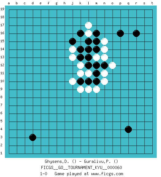 Last move : 1-0 2008 May 26 10:39:14 [Event "FICGS__GO__TOURNAMENT_KYU__000060"] [Site "FICGS"] [Date "2008.05.23"] [Round "1"] [Black "Ghysens,Dirk"] [White "Guralivu,Paul-Iosif"] [Result "1-0"] 1.k10 k11 2.q4 j10 3.r16 k9 4.l10 l9 5.m10 m9 6.d3 n10 7.m11 l11 8.m12 n11 9.n12 o12 10.l12 k12 11.p16 n13 12.m14 m13 13.l13 l14 14.k13 j13 15.k14 j14 16.l15 k15 17.l14 l16 18.m16 n14 19.m15 n15 20.k16 l17 21.j15 1-0 Here are the names of the openings (joseki) played in the four corners : Corner q4 : q4 l9 Hoshi (Hwajeom, Seongjeom, Xingwei`) 4-4 Point. The star or hoshi (4-4) point, emphasizing influence at the potential expense of territory. Corner d4 : d3 1-0 Komoku (Somok, Xiao~mu`) 3-4 Point. The komoku (3-4) point is the traditional corner enclosure move.. Player Black won this Go (weiqi, baduk) game. Follow this game move after move (download)Do not make moves that strengthen your opponent ! (Anonymous) For a mechanic, you seem to do an excessive amount of thinking. (C-3PO in Star Wars ep.2)