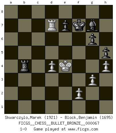 Last move : 1-0 2008 May 23 21:34:52 [Event "FICGS__CHESS__BULLET_BRONZE__000067"] [Site "FICGS"] [Date "2008.05.23"] [Round "1"] [White "Skwarczylo,Marek"] [Black "Block,Benjamin"] [Result "1-0"] [WhiteElo "1921"] [BlackElo "1695"] 1.d4 Nf6 2.Nf3 g6 3.c4 Bg7 4.Nc3 d5 5.cxd5 Nxd5 6.e4 Nxc3 7.bxc3 c5 8.Be3 Qa5 9.Qd2 Nc6 10.Rc1 cxd4 11.cxd4 Qxd2+ 12.Kxd2 O-O 13.Bb5 f5 14.Bxc6 bxc6 15.exf5 Bxf5 16.Rxc6 Rab8 17.Ra6 Rb2+ 18.Kd1 Rb1+ 19.Bc1 Rc8 20.Ke2 Rc2+ 21.Nd2 R2xc1 22.Rxc1 Rxc1 23.Ra4 Rc2 24.g3 Kf7 25.Kd1 Rc7 26.Nb3 Bc2+ 27.Ke2 h5 28.h4 Bxb3 29.axb3 Rc2+ 30.Ke3 Rc3+ 31.Ke4 Rxb3 32.Rxa7 Rb4 33.Rd7 1-0 This chess game has been lost on time (started : 2008.05.23 20:27:38) King's Indian : East Indian defense Kingside Castling by player Black (move 12) Player White won this chess game. Follow this game move after move (download)Alekhine is a poet who creates a work of art out of something that would hardly inspire another man to send home a picture post card. (Max Euwe) Rauchen ist dem Schachspieler bei seiner Arbeit, also im Wettkampf, untersagt. (Viktor Kortschnoi) Ciertamente el estado mental actual de Bobby Fischer es una tragedia. Uno de los mas grandes jugadores de Ajedrez del mundo -el orgullo y pena del Ajedrez Americano. (Frank Brady) Dieu déplace le joueur, et celui-ci la pièce. Quel Dieu derrière Dieu commence donc la trame ? Arturo Perez-Reverte (prix de littérature policière 1993). Only sick music makes money today. (Friedrich Nietzsche)