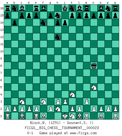Last move : 0-1 2008 May 27 17:49:22 [Event "FICGS__BIG_CHESS__TOURNAMENT__000023"] [Site "FICGS"] [Date "2008.05.24"] [Round "1"] [White "Block,Benjamin"] [Black "Gounant,Stanislas"] [Result "0-1"] [WhiteElo "1291"] [BlackElo ""] 1.j2-k4 j15-k13 2.h1-o7 g16-f14 3.o7-f15 h16-o10 4.p1-o3 o10-f2 5.g1-f3 f2-b6 6.b1-c3 k13-h12 7.f15-p6 b6-p6 8.m2-m3 b15-b14 9.o3-n5 p6-n8 0-1 Follow this game move after move (download)The tactician knows what to do when there is something to do; whereas the strategian knows what to do when there is nothing to do. (Gerald Abrahams) Schach verlangt totale Konzentration. (Robert James Fischer) Siempre es mejor sacrificar los hombres de tu oponente. (Savielly Tartakower) Le thème de l'attaque double intervient d'une manière ou d'une autre dans l'immense majorité des combinaisons. (Youri Averbakh) An expert is a man who has made all the mistakes which can be made in a very narrow field. (Niels Bohr)