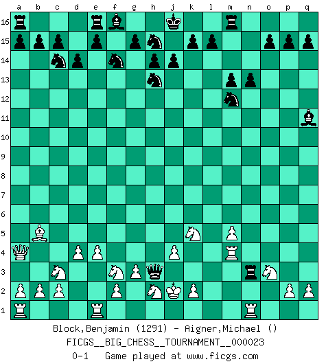 Last move : 0-1 2008 June 6 18:27:50 [Event "FICGS__BIG_CHESS__TOURNAMENT__000023"] [Site "FICGS"] [Date "2008.05.24"] [Round "1"] [White "Block,Benjamin"] [Black "Aigner,Michael"] [Result "0-1"] [WhiteElo "1291"] [BlackElo ""] 1.j2-k4 n15-n13 2.h1-o7 p16-q14 3.o7-f15 g16-f14 4.f15-a10 k16-l14 5.a10-a4 o16-k12 6.d2-d4 q16-n16 7.c1-k8 d15-d14 8.e2-e4 n16-n14 9.k8-q14 n14-q14 10.m2-m4 b16-c14 11.b1-c3 j15-h13 12.n2-n4 h16-o10 13.g2-g3 o10-o2 14.f1-b5 k12-f8 15.l1-m2 f8-k4 16.m2-k4 o2-l2 17.k1-l3 c16-n6 18.m4-m5 n6-m7 19.j3-j4 l14-m12 20.g1-j2 q14-k14 21.p1-o3 l2-o2 22.m1-m2 o2-h8 23.j2-g1 k14-k4 24.j1-j2 m15-m13 25.o1-k5 m7-k5 26.l3-k5 k4-n4 27.g1-f3 l16-q11 28.m2-m4 n4-n3 29.q1-n1 h8-h3 0-1 Follow this game move after move (download)In a gambit you give up a Pawn for the sake of getting a lost game. (Samuel Standige Boden) Es macht mich traurig, wenn ich sehe, dass Golfprofis mehr verdienen als Schachsportler. Obwohl ich davon überzeugt bin, dass wir Schachspieler viel härter trainieren müssen als die Golfer. (Alexandra Kosteniuk) Ser exitoso en el Ajedrez te permite descubrir tu propia personalidad. Eso es lo que deseo para los niños de mi clase. (Saudin Robovic) D'abord les bases : Jouez et étudiez, puis étudiez et jouez, ensuite jouez et étudiez, puis étudiez et jouez. Deuxièmement : Donnez toujours le meilleur de vous-même ! (Ken Smith) Computer Science is no more about computers than astronomy is about telescopes. (Edsger W. Dijkstra)