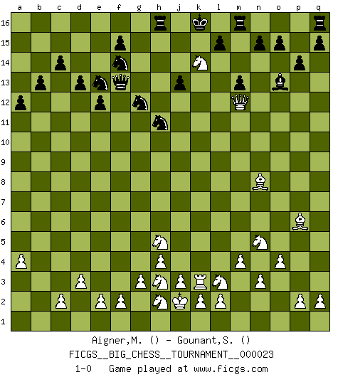 Last move : 1-0 2008 June 6 3:2:10 [Event "FICGS__BIG_CHESS__TOURNAMENT__000023"] [Site "FICGS"] [Date "2008.05.24"] [Round "1"] [White "Aigner,Michael"] [Black "Gounant,Stanislas"] [Result "1-0"] [WhiteElo ""] [BlackElo ""] 1.a2-a4 m15-m13 2.b1-c3 p15-p14 3.m2-m4 j15-k13 4.l1-p5 h16-o10 5.c3-e4 l16-o13 6.g2-g3 o16-p15 7.o2-o4 e15-e13 8.p1-o3 f16-c13 9.n2-n3 d15-d14 10.o1-m3 c16-k9 11.d2-d3 g16-f14 12.c1-g5 k16-l14 13.j2-k4 p15-b2 14.a1-b1 b2-p15 15.b1-b10 o10-j15 16.e4-f6 b15-b14 17.m3-n4 c15-c14 18.b10-g10 g15-g13 19.h1-a8 d14-d13 20.e1-b1 e13-e12 21.b1-b7 b14-b13 22.h3-h4 b16-d15 23.f1-n8 h15-j13 24.b7-f7 e16-f16 25.a8-c8 j15-g15 26.n4-p6 h14-h13 27.f7-f13 k9-f13 28.g10-g13 g15-h15 29.m1-m3 j13-g12 30.p5-q6 l14-j13 31.m3-k3 j13-h11 32.q6-f16 a16-f16 33.g13-f13 h15-f13 34.c8-c6 h11-f12 35.o3-n5 p16-o14 36.k4-l6 k13-h12 37.k1-l3 o14-n12 38.g1-h3 f12-d11 39.j1-j2 d15-e13 40.q1-b1 c13-h8 41.f6-h5 n12-l13 42.b1-b7 a15-a13 43.g5-j7 a13-a12 44.c6-k6 h8-j7 45.l6-j7 p15-m12 46.k6-k12 j16-j15 47.k12-m12 k15-k14 48.m12-h12 d11-f10 49.j7-l8 f16-h16 50.b7-j7 j14-j13 51.l8-m10 j15-k15 52.h12-m12 l13-j12 53.m10-k11 f10-h11 54.j7-j12 h13-j12 55.k11-l13 k15-j15 56.l13-j12 j15-k16 57.j12-k14 1-0 Follow this game move after move (download)The way he plays Chess demonstrates a man's whole nature. (Stanley Ellin) Mit Schach schule ich mein Gefühl für Geometrie, was für Tennis und Schach gleichermaßen wichtig ist. (Boris Becker) Un mal plan es mejor que no tener ningún plan. (Frank Marshall) On n'a jamais que l'âge auquel on a commence à jouer aux échecs car après on cesse de vieillir. (Capablanca) You must do what you feel is right... of course. (Obi-Wan Kenobi in Star Wars ep.4)