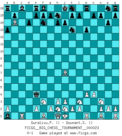 Last move : 0-1 2008 May 26 20:3:36 [Event "FICGS__BIG_CHESS__TOURNAMENT__000023"] [Site "FICGS"] [Date "2008.05.24"] [Round "1"] [White "Guralivu,Paul-Iosif"] [Black "Gounant,Stanislas"] [Result "0-1"] [WhiteElo ""] [BlackElo ""] 1.k1-l3 m15-m13 2.m2-m4 p15-p14 3.l1-o4 j15-k13 4.o4-c15 h16-o10 5.p1-o3 o10-f2 6.g1-f3 f2-b6 7.b1-c3 l16-o13 8.d2-d3 o16-p15 9.c1-k8 a15-a13 10.c15-b16 d15-d14 11.b16-c15 g16-f14 12.k8-j7 b6-b2 13.c3-e4 b2-c2 14.e1-c1 c2-a4 15.c15-b14 o13-e4 16.d3-e4 a4-e4 17.n2-n4 p15-a1 0-1 Follow this game move after move (download)Later, I began to succeed in decisive games. Perhaps because I realized a very simple truth: not only was I worried, but also my opponent. (Mikhail Tal) Es liegt in der Natur, vernüftig zu denken und unlogisch zu handeln. (Anatole France) La mitad de las variaciones que son calculadas en una partida de torneo, resultan ser completamente superfluas. Desafortunadamente, nadie sabe por adelantado cual mitad. (Jan Tinman) Botvinnik disait en comparant les échecs à la musique: Il existe une science dont le but est l'étude de l'acoustique et des sons. Mais il y a aussi un art qui se sert de l'océan des sons : c'est la musique. De toute évidence, il en est de même pour la pensée. La logique est l'étude des lois de la réflexion et les échecs reflètent, en tant qu'art, le côté logique de la réflexion, sous la forme d'images artistiques... Extrait de Fischer - Spassky, Reykjavik 1972 par Alexander & F. Wyndham (Ed. Solar), p 37. You must have a dream in order to have it come true. (A.P.J. Kalam)