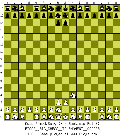 Last move : 1-0 2008 May 26 9:29:21 [Event "FICGS__BIG_CHESS__TOURNAMENT__000023"] [Site "FICGS"] [Date "2008.05.24"] [Round "1"] [White "Ould Ahmed,Samy"] [Black "Baptista,Rui"] [Result "1-0"] [WhiteElo ""] [BlackElo ""] 1.j2-k4 1-0 Follow this game move after move (download)Many Chess players were surprised when after the game, Fischer quietly explained: 'I had already analyzed this possibility' in a position which I thought was not possible to foresee from the opening. (Mikhail Tal) Die Idee von Capablanca, Schach als Fach in den Schulen zu lehren, ist großartig. (Fidel Castro) El estómago es una parte esencial del maestro de Ajedrez. (Bent Larsen) Il vaut mieux sacrifier les pièces de l'adversaire. (Xavier Tartacover) It's not the size of the dog in the fight, it's the size of the fight in the dog. (Mark Twain)