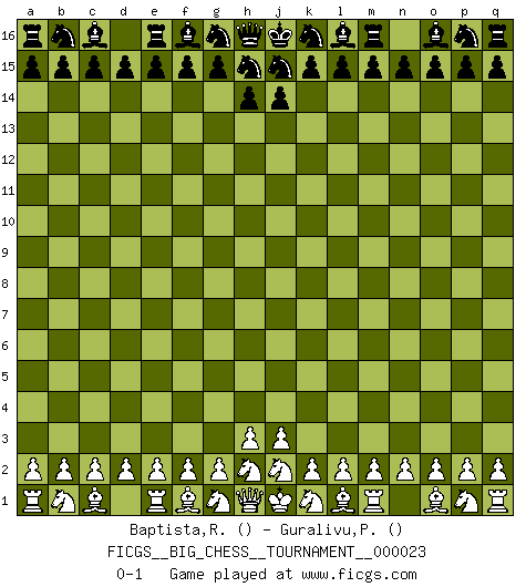 Last move : 0-1 2008 May 26 9:29:31 [Event "FICGS__BIG_CHESS__TOURNAMENT__000023"] [Site "FICGS"] [Date "2008.05.24"] [Round "1"] [White "Baptista,Rui"] [Black "Guralivu,Paul-Iosif"] [Result "0-1"] [WhiteElo ""] [BlackElo ""] 0-1 Follow this game move after move (download)Every Chess master was once a beginner. (Chernev) Vielleicht wirkt die Aura früherer Spieler glanzvoller als die der heutigen Spieler, aber das liegt daran, dass man kein Programm wie Fritz hatte, das einem all die Löcher in ihren Partien zeigt. (Vladimir Kramnik) El muchacho (en ese entonces un niño de 12 años llamado Anatoly Karpov) no tiene ni idea de lo que es el Ajedrez y no hay futuro en absoluto para el en esta profesión. (Mikhail Botvinnik) Les erreurs sont comme les malheurs, elles n'arrivent jamais seules. (Siegbert Tarrasch) Home computers are being called upon to perform many new functions, including the consumption of homework formerly eaten by the dog. (Doug Larson)