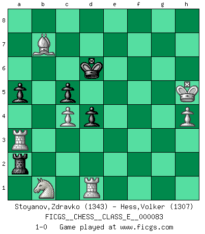 Last move : 1-0 2008 June 6 19:7:41 [Event "FICGS__CHESS__CLASS_E__000083"] [Site "FICGS"] [Date "2008.05.24"] [Round "1"] [White "Stoyanov,Zdravko"] [Black "Hess,Volker"] [Result "1-0"] [WhiteElo "1343"] [BlackElo "1307"] 1.e4 d6 2.Nf3 Nf6 3.c3 Nxe4 4.Qa4+ Bd7 5.Qxe4 Bc6 6.Qf4 e5 7.Qf5 Nd7 8.Bc4 Qe7 9.O-O f6 10.Re1 O-O-O 11.d4 g6 12.Qc2 e4 13.Nfd2 f5 14.d5 Bxd5 15.Bxd5 Nc5 16.Nf3 Nd3 17.Bg5 Qe8 18.Re3 Be7 19.Bxe7 Qxe7 20.Qxd3 Qf6 21.Qd4 Qxd4 22.Nxd4 c6 23.Bb3 d5 24.f3 f4 25.Re1 e3 26.Ne6 Rhf8 27.Nxf8 Rxf8 28.c4 d4 29.Bc2 Rd8 30.Bd3 c5 31.Na3 a6 32.g3 Rf8 33.Kg2 Rf7 34.h4 fxg3 35.Kxg3 Kc7 36.f4 Kd6 37.Kg4 Rf6 38.Kg5 Rf7 39.Be4 h6+ 40.Kg4 Rf6 41.Bxb7 h5+ 42.Kg5 Rf5+ 43.Kxg6 Rxf4 44.Kxh5 Rf2 45.Rad1 Rxb2 46.Nb1 Rxa2 47.Rxe3 a5 48.Ra3 1-0 King's pawn Opening Kingside Castling by player White (move 9) Queenside Castling by player Black (move 10) Player White won this chess game. Follow this game move after move (download)Chess is mental torture. (Garry Kasparov) Wir können eben der zündenden Macht des Opfers nicht wiederstehen, denn die Begeisterung für das Opfer liegt in der Natur des Menschen. (Rudolf Spielmann) Observen a Garry Kasparov. Después de una derrota, invariablemente el gana la próxima partida. Prácticamente hace pedazos a su siguiente oponente. Eso es algo que tenemos que aprender a lograr. (Maurice Ashley) Le plus grand jeu de l'esprit jamais inventé, plus vous l'apprenez, plus vous y prenez du plaisir. (Garry Kasparov) Thibault, I ask for draw. Game 13876. - Sorry Ilmars, you won. (FICGS chat)