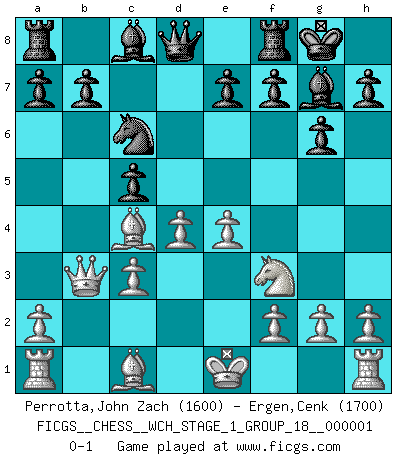 Last move : 0-1 2006 September 27 21:45:19 [Event "FICGS__CHESS__WCH_STAGE_1_GROUP_18__000001"] [Site "FICGS"] [Date "2006.07.19"] [Round "1"] [White "Perrotta,John Zach"] [Black "Ergen,Cenk"] [Result "0-1"] [WhiteElo "1600"] [BlackElo "1700"] 1.d4 Nf6 2.c4 g6 3.Nc3 d5 4.cxd5 Nxd5 5.e4 Nxc3 6.bxc3 Bg7 7.Nf3 c5 8.Bc4 Nc6 9.Qb3 O-O 0-1 This chess game has been lost on time (started : 2006.07.19 17:43:42) King's Indian defense, 3.Nc3 Kingside Castling by player Black (move 9) Player Black won this chess game. Follow this game move after move (download)The laws of Chess do not permit a free choice: you have to move whether you like it or not. (Emanuel Lasker) Schach ist ein schwarz-weisser Dschungel. (Garry Kasparov) Peones: ellos son el alma de esta partida, solos forman el ataque y la defensa. (Philidor) Je ne suis pas le dernier à jouer lâchement des coups douteux pendant le zeïtnot de l'adversaire pour l'achever: en effet les coups qui font le plus peur sont ceux que l'on ne comprend pas. Je me fais souvent peur quand je joue. (Un professeur anonyme) If you are good, you will be assigned all the work. If you are really good, you will get out of it. (Dan Rotaru)