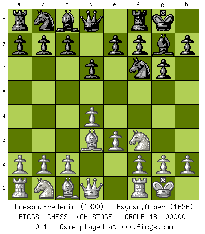 Last move : 0-1 2006 August 27 6:47:7 [Event "FICGS__CHESS__WCH_STAGE_1_GROUP_18__000001"] [Site "FICGS"] [Date "2006.07.19"] [Round "1"] [White "Crespo,Frederic"] [Black "Baycan,Alper"] [Result "0-1"] [WhiteElo "1300"] [BlackElo "1626"] 1.d4 Nf6 2.Nf3 g6 3.e3 Bg7 4.Bd3 O-O 5.O-O d6 0-1 This chess game has been lost on time (started : 2006.07.19 17:43:42) King's Indian : East Indian defense Kingside Castling by player Black (move 4) Kingside Castling by player White (move 5) Player Black won this chess game. Follow this game move after move (download)It is peculiar but a fact nevertheless, that gamblers in chess always have enthusiastic followers. (Botvinnik) Ich habe kein Problem mit Frauen, sondern nur mit dem Niveau ihres Schachspiels (Judith Polgar) El Ajedrez es de 30 a 40 por ciento psicología. Uno no cuenta con esto cuando se juega contra una computadora. No lo puedo confundir. (Judith Polgar) Fischer est le meilleur joueur du monde et Karpov n'est qu'un joueur de bistrot. (Garry Kasparov, agé de 16 ans) I feel so... helpless. (C-3PO in Star Wars ep.3)
