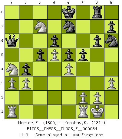 Last move : 1-0 2008 May 29 20:42:59 [Event "FICGS__CHESS__CLASS_E__000084"] [Site "FICGS"] [Date "2008.05.25"] [Round "1"] [White "Morice,Fabrice"] [Black "Konuhov,Konstantin"] [Result "1-0"] [WhiteElo "1500"] [BlackElo "1311"] 1.e4 e5 2.Nf3 Nc6 3.d4 f6 4.d5 Nce7 5.c4 d6 6.h3 c6 7.Nc3 a6 8.Be2 b5 9.cxb5 axb5 10.Be3 b4 11.Na4 c5 12.Bb5+ Kf7 13.Bc4 Ba6 14.Bxa6 Rxa6 15.b3 f5 16.Qc2 g6 17.Ng5+ Ke8 18.Ne6 Qb8 19.O-O Bh6 20.Bxh6 Nxh6 21.a3 Rg8 22.Qc4 Qb7 23.Qxa6 Qxa6 24.Nc7+ 1-0 Scotch Opening Kingside Castling by player White (move 19) Player White won this chess game. Follow this game move after move (download)Look at Garry Kasparov. After he loses, invariably he wins the next game. He just kills the next guy. That's something that we have to learn to be able to do. (Maurice Ashley) Wenn Du absolut nicht mehr weißt, was Du tun sollst, dann ist es Zeit für Panik. (John van der Wiel) Debemos de asegurarnos de que el Ajedrez no se convierta en un lenguaje muerto, muy interesante, pero tan solo para un grupo muy pequeño. (Sytze Faber) Des combinaisons [dans le jeu d'échecs] pareilles à des mélodies. Je crois entendre pour ainsi dire la musique des coups... (Vladimir Nabokov) There is a very easy way to return from a casino with a small fortune : go there with a large one. (Jack Yelton)