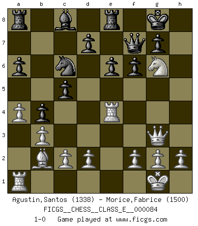 Last move : 1-0 2008 June 6 15:3:30 [Event "FICGS__CHESS__CLASS_E__000084"] [Site "FICGS"] [Date "2008.05.25"] [Round "1"] [White "Agustin,Santos"] [Black "Morice,Fabrice"] [Result "1-0"] [WhiteElo "1338"] [BlackElo "1500"] 1.e4 c5 2.b3 Nc6 3.Bb2 e6 4.Bd3 Nf6 5.Nc3 Be7 6.Nf3 a6 7.e5 Ng4 8.Ne4 Nh6 9.O-O O-O 10.Qe2 Nf5 11.Rfe1 b5 12.a4 b4 13.Nd6 Nxd6 14.exd6 Bxd6 15.Bxh7+ Kxh7 16.Qd3+ Kg8 17.Qxd6 Qe7 18.Qg3 f6 19.Nh4 Qf7 20.Ng6 Re8 21.Re4 1-0 Sicilian defense Kingside Castling by player White (move 9) Kingside Castling by player Black (move 9) Player White won this chess game. Follow this game move after move (download)Chess is life. (Bobby Fischer) Glücklicherweise sind Großmeister Ruben Fines reine Schachbücher weniger phallozentrisch [als seine Schachpsychologie] und deswegen auch weniger lächerlich. (Nigel Short) Si yo gano un torneo, yo lo gano por mí mismo. Yo hago las jugadas. Nadie me ayuda. (Bobby Fischer) La victoire dans une partie d'Echecs appartient la plupart du temps à celui qui voit un peu plus loin que l'adversaire. (Lasker) Luck has a peculiar habit of favoring those who don't depend on it. (Author unknown)