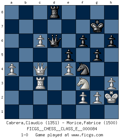 Last move : 1-0 2008 September 27 22:29:4 [Event "FICGS__CHESS__CLASS_E__000084"] [Site "FICGS"] [Date "2008.05.25"] [Round "1"] [White "Cabrera,Claudio"] [Black "Morice,Fabrice"] [Result "1-0"] [WhiteElo "1351"] [BlackElo "1500"] 1.d4 Nf6 2.c4 e6 3.Nf3 d5 4.Nc3 Bb4 5.Bg5 Bxc3+ 6.bxc3 Nbd7 7.e3 h6 8.Bh4 O-O 9.Bd3 a6 10.O-O Qe8 11.a3 dxc4 12.Bxc4 b5 13.Bb3 Bb7 14.Qe2 Rc8 15.Rfc1 Bd5 16.c4 bxc4 17.Bxc4 Bxc4 18.Rxc4 g5 19.Bg3 Kg7 20.Bxc7 Nd5 21.Bd6 Ne7 22.Rac1 Rxc4 23.Qxc4 Rg8 24.h3 Nd5 25.Qxa6 N7b6 26.Bc5 Nd7 27.Qc4 Nxc5 28.dxc5 Qc8 29.Qd4+ f6 30.e4 Nf4 31.Kf1 Rd8 32.Qc4 Nd3 33.Rc3 Nf4 34.Kg1 e5 35.c6 Qc7 36.Kh2 Qd6 37.a4 1-0 Queen's pawn game Kingside Castling by player Black (move 8) Kingside Castling by player White (move 10) Player White won this chess game. Follow this game move after move (download)All I want to do, ever, is just play Chess. (Bobby Fischer) Weshalb minderdergeübte Spieler mit g2-g4 beginnen? Die betreffenden sind unschlüssig, ob sie nun rechts (h4) oder links (f4) beginnen sollen, und in ihrer Ratlosigkeit entschliessen sie sich nach guter Bürgerart dazu, den goldenen Mittelweg zu wählen. (Aaron Nimzowitsch) ¿Cual es el objetivo de jugar una apertura de gambito?... Para adquirir una reputación de ser un jugador apuesto a costo de perder el juego. (Siegbert Tarrasch) Roi des jeux et jeu des rois, les échecs portent en eux un sentiment d'infini. Ils donnent à celui qui s'est efforcé d'en approfondir les arcanes l'impression de n'être pas à la mesure de l'homme; en fait, ils constituent un résumé de l'univers, un microcosme, et figurent cette grande échelle qui, dans les plans de la lumière descend jusqu'à la matière, qui des abîmes insondables remonte jusqu'en l'infini de Dieu. (Pyrame) The beginning is the most important part of the work. (Plato)