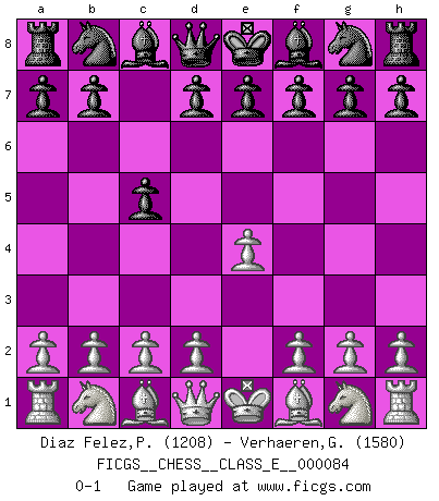 Last move : 0-1 2008 July 5 14:27:3 [Event "FICGS__CHESS__CLASS_E__000084"] [Site "FICGS"] [Date "2008.05.25"] [Round "1"] [White "Diaz Felez,Paco"] [Black "Verhaeren,Gertjan"] [Result "0-1"] [WhiteElo "1208"] [BlackElo "1580"] 1.e4 c5 0-1 This chess game has been lost on time (started : 2008.05.25 22:9:33) Sicilian defense Player Black won this chess game. Follow this game move after move (download)Human affairs are like a Chess game: only those who do not take it seriously can be called good players. (Hung Tzu Ch'eng) Ein Isolani verdüstert die Stimmung auf dem ganzen Schachbrett. (Savielly Grigorievitsch Tartakower) Nada excita más a Grandes Maestros aburridos que una novedad teórica. (Dominic Lawson) Vous n'êtes pas toujours obligé de jouer le meilleur coup. Un coup doit être actif, entreprenant, correct et beau ! (David Bronstein) All war is based on deception. (Sun Tzu)