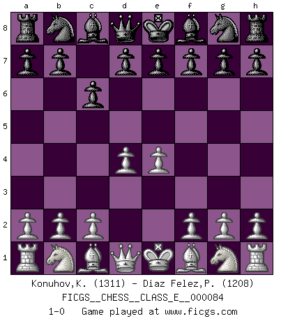 Last move : 1-0 2008 July 5 2:26:17 [Event "FICGS__CHESS__CLASS_E__000084"] [Site "FICGS"] [Date "2008.05.25"] [Round "1"] [White "Konuhov,Konstantin"] [Black "Diaz Felez,Paco"] [Result "1-0"] [WhiteElo "1311"] [BlackElo "1208"] 1.e4 c6 2.d4 1-0 This chess game has been lost on time (started : 2008.05.25 22:9:33) Caro-Kann defense Player White won this chess game. Follow this game move after move (download)A strong memory, concentration, imagination, and a strong will is required to become a great Chess player. (Bobby Fischer) Vielleicht wirkt die Aura früherer Spieler glanzvoller als die der heutigen Spieler, aber das liegt daran, dass man kein Programm wie Fritz hatte, das einem all die Löcher in ihren Partien zeigt. (Vladimir Kramnik) El Ajedrez es despiadado: debes de estar preparado para matar gente. (Nigel Short) Les erreurs sont comme les malheurs, elles n'arrivent jamais seules. (Siegbert Tarrasch) After growing wildly for years, the field of computing appears to be reaching its infancy. (John Pierce)