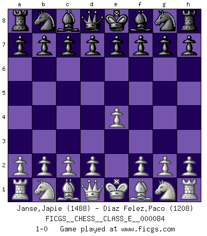 Last move : 1-0 2008 July 11 2:48:29 [Event "FICGS__CHESS__CLASS_E__000084"] [Site "FICGS"] [Date "2008.05.25"] [Round "1"] [White "Janse,Japie"] [Black "Diaz Felez,Paco"] [Result "1-0"] [WhiteElo "1488"] [BlackElo "1208"] 1.e4 1-0 This chess game has been lost on time (started : 2008.05.25 22:9:33) King's pawn Opening Player White won this chess game. Follow this game move after move (download)Avoid the crowd. Do your own thinking independently. Be the Chess player, not the Chess piece. (Ralph Charell) Kein Großmeister ist normal. Sie unterscheiden sich nur im Ausmaß Ihrer Verrücktheit. (Viktor Kortschnoi) No volvere nunca a jugar contigo. Has insultado a mi amigo. - cuando un oponente se maldijo por una mala jugada (Miguel Najdorf) Demandez au pauvre Cg1 ce qu'il en pense. Eduard Gufeld à propos de la variante Saemisch de l'Est-Indienne. Life is painting a picture, not doing a sum. (Oliver Wendell Holmes, Jr.)