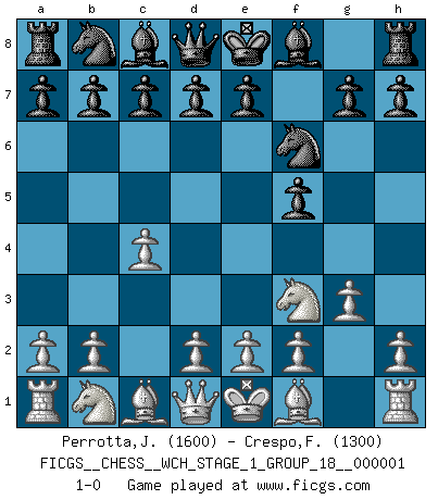 Last move : 1-0 2006 August 24 6:34:41 [Event "FICGS__CHESS__WCH_STAGE_1_GROUP_18__000001"] [Site "FICGS"] [Date "2006.07.19"] [Round "1"] [White "Perrotta,John Zach"] [Black "Crespo,Frederic"] [Result "1-0"] [WhiteElo "1600"] [BlackElo "1300"] 1.c4 f5 2.Nf3 Nf6 3.g3 1-0 This chess game has been lost on time (started : 2006.07.19 17:43:42) English : Anglo-Dutch defense Player White won this chess game. Follow this game move after move (download)The combination player thinks forward; he starts from the given position, and tries the forceful moves in his mind. (Emanuel Lasker) Es ist im Leben wie im Schachspiel. Wir entwerfen einen Plan, dieser bleibt jedoch bedingt durch das, was im Schachspiel dem Gegner, im Leben dem Schicksal zu tun belieben wird. (Arthur Schopenhauer) Me dio la sensación de como si yo estuviera jugando en contra del mismo Ajedrez. - al estar jugando en contra de Robert Fischer (Walter Shipman) La vie est comme un jeu d'échecs : nous esquissons un plan, mais celui-ci est tributaire de ce que daignent faire l'adversaire aux échecs et le destin dans la vie. (Arthur Schopenhauer) I don't know, I don't care, and it doesn't make any difference. (Albert Einstein)